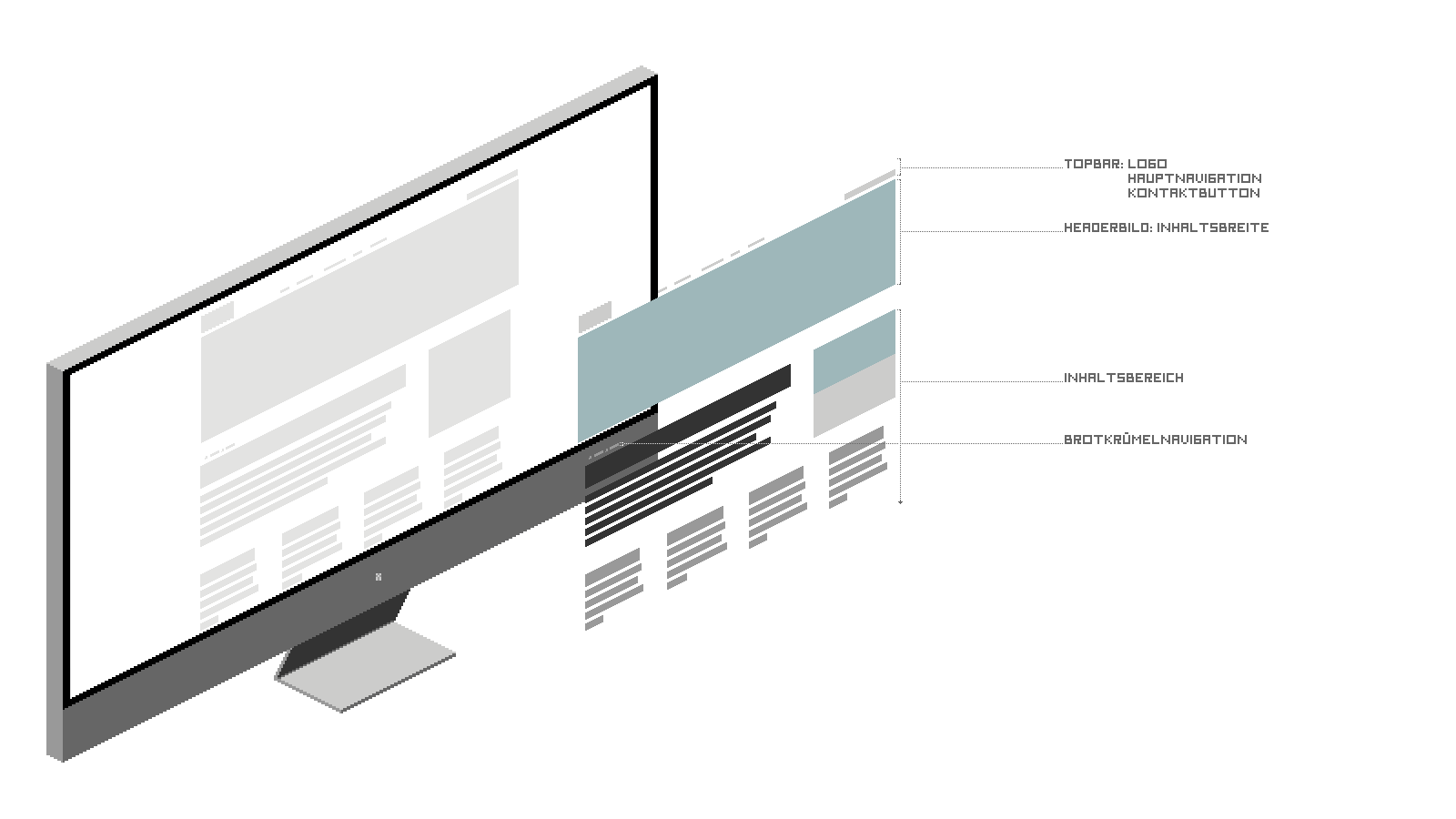 - Reiter: Die Reiter sind mittig am oberen Bildschirmrand angeordnet. Um dem Headerelement mehr Platz zur Entfaltung zu geben, wird die zweite Navigationsebene erst duch das Hovern über den Reiter angezeigt.