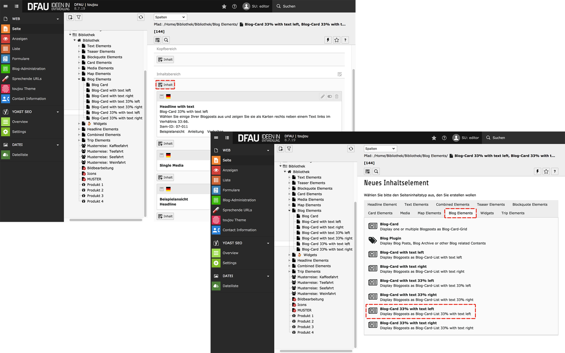 - Im Reiter Blog Elements wählen Sie Blog-Card 33% with text left.