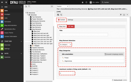 - Bestimmen Sie im Feld maximum number of blog cards (default = 4), wie viele Artikel innerhalb dieses Elements dargestellt werden sollen (> 2)