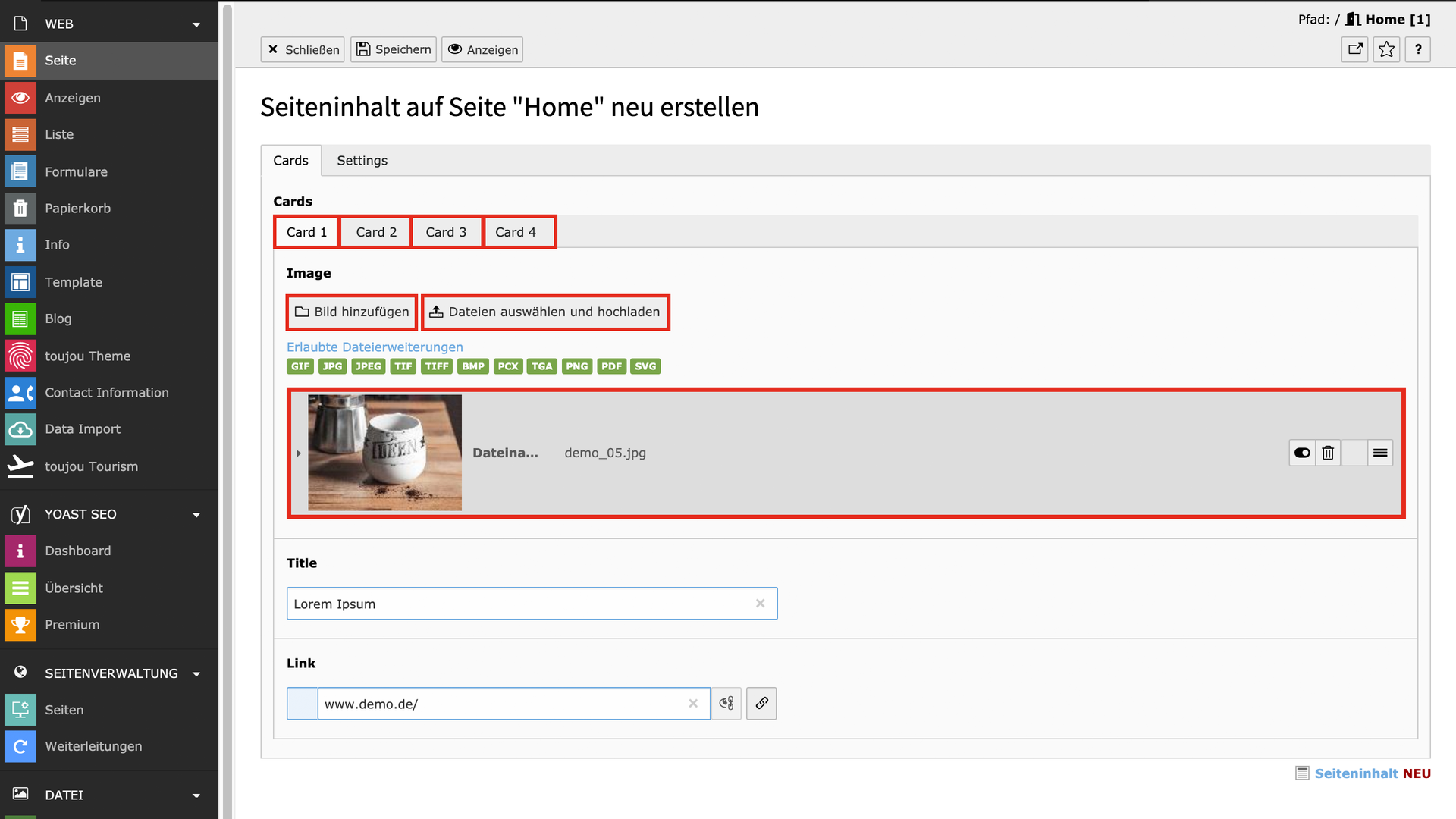 - Klicken Sie auf den Button Inhalt, um eine Imagecard zu erstellen.