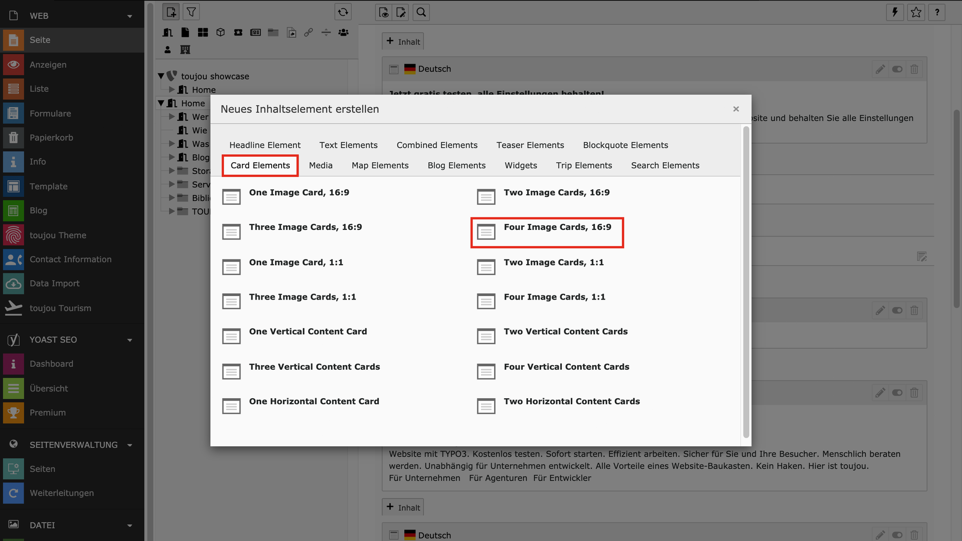 - Im Reiter Card Elements wählen Sie Four image cards, 16:9.