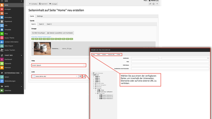 - Wählen Sie aus einem der verfügbaren Reiter, um innerhalb der Unterseiten, Elemente oder auf eine externe URL zu verlinken.