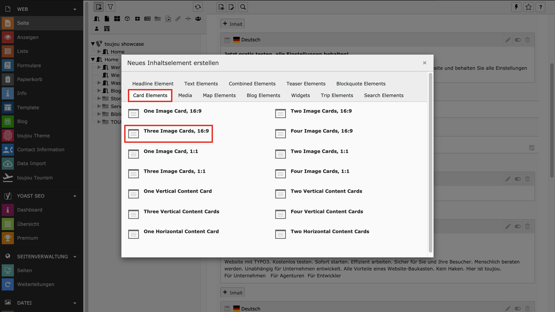 - Im Reiter Card Elements wählen Sie Three image cards, 16:9.