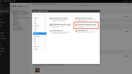 - Klicken Sie auf +Inhalt und wählen Sie im Reiter Collections das Element Filtered pages as Image Card collection.