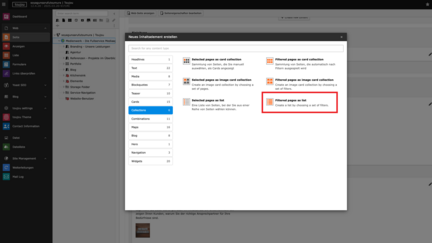 - Klicken Sie auf +Inhalt und wählen Sie im Reiter Collections das Element Filtered pages as list.