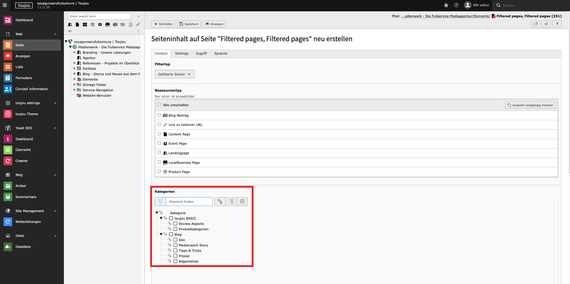 - Wählen Sie die Kategorien durch Klick auf das Kästchen neben dem Kategorienamen. Es erscheinen nur Seiten, die diese Kategorie in ihren Seiteneigenschaften enthalten.