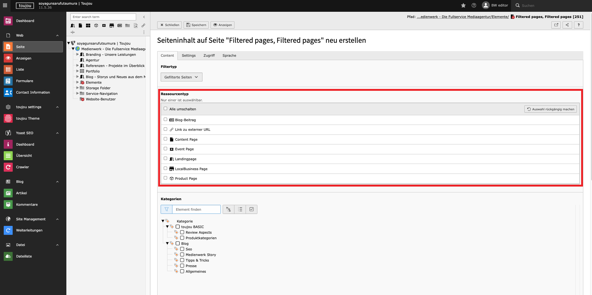 - Wählen Sie im Bereich Ressourcentyp den gewünschten Seitentyp, der als Referenz für den Card-Teaser dienen soll.