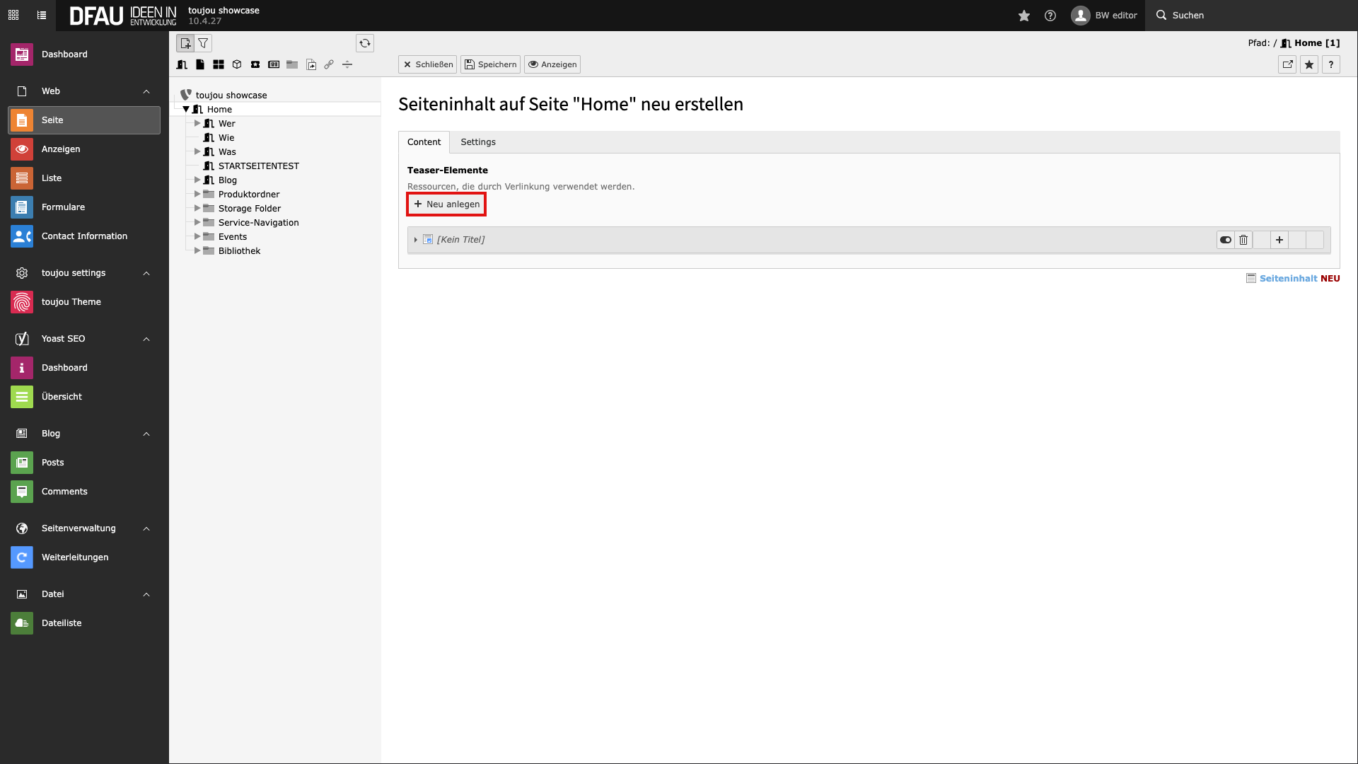 In den Teaser-Cards erscheinen Bild, Titel und Teasertext automatisch. Die dazugehörigen Daten kommen aus den Seiteneigenschaften der jeweiligen Seite. Für ein Bild muss im Reiter Ressourcen eine Datei hinterlegt sein, für den Teasertext im Reiter Metadaten im Textfeld Zusammenhang der entsprechende Text. Zudem erscheint immer das Icon für den jeweiligen Seitentyp. Außerdem gilt: Sind Kategorien für eine Seite hinterlegt, werden diese ausgespielt.