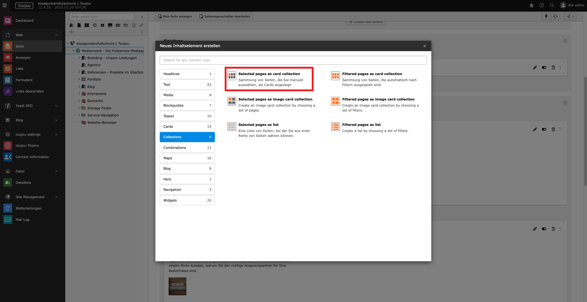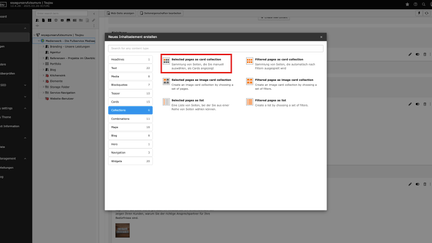 - Klicken Sie auf +Inhalt und wählen Sie im Reiter Collection das Element Selected Pages as Card Collection.