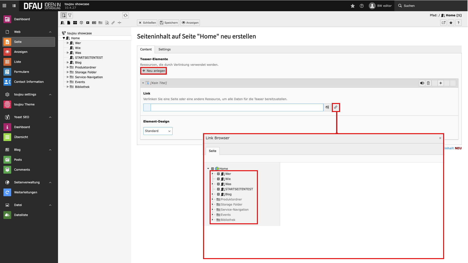 Hinweise zur Funktionsweise des Elements: Das Element erlaubt nur eine Verlinkung zu internen Website-Seiten.