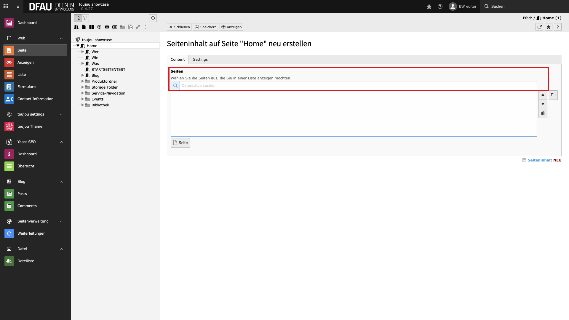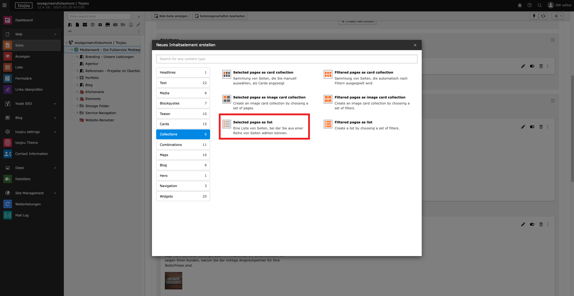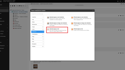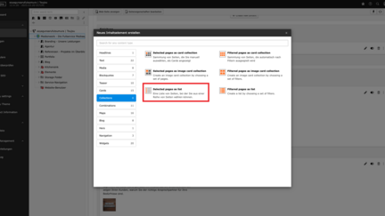 - Klicken Sie auf +Inhalt und wählen Sie im Reiter Collections das Element Selected Pages as List an.