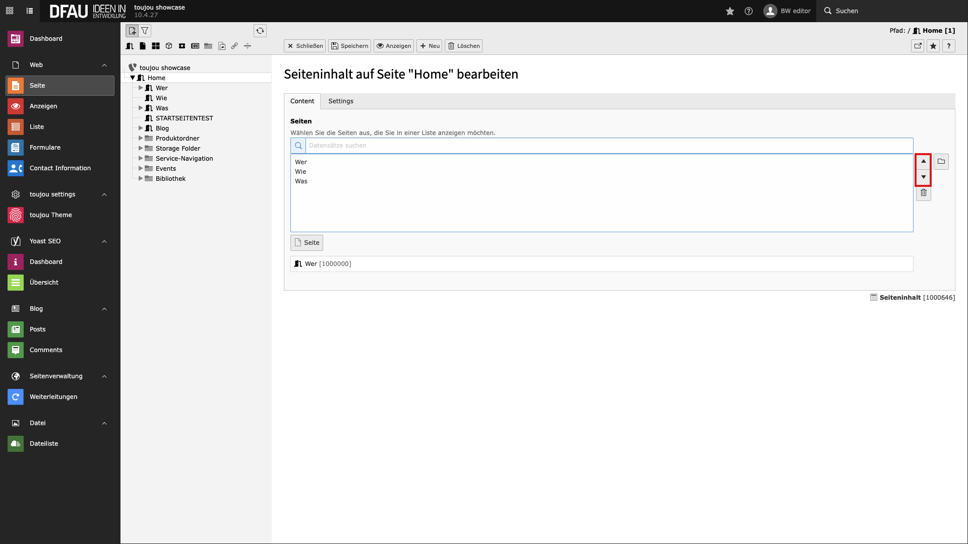 - Mit Klick auf die Pfeile rechts des Feldes können Sie die Position der jeweiligen Seite jederzeit editieren – und so die Reihenfolge der Anzeige im Frontend steuern.