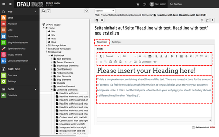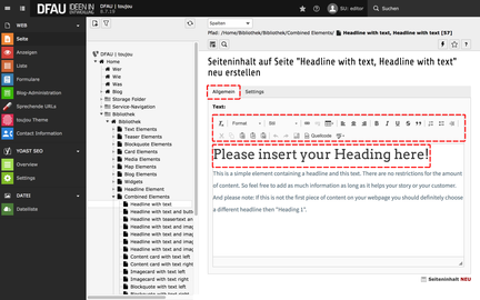 Durch seine Darstellung von Blindtexten dient Ihnen dieses kombinierte Element als Starthilfe. Das Element verhält sich nicht unterschiedlich zum Element Text, wenn dessen Inhalt die selben Formatierungen und Auszeichnungen enthält. Seine abweichende Elementbezeichnung unterstützt ggf. eine bessere Orientierung in der Backend-Ansicht.