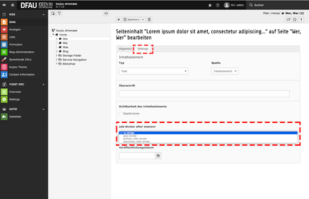 - Klicken Sie innerhalb eines beliebigen Elements auf den Reiter Settings und wählen dann im Dropdown-Menü add divider after element zwischen grey divider, primary-color divider oder secondary-color divider.