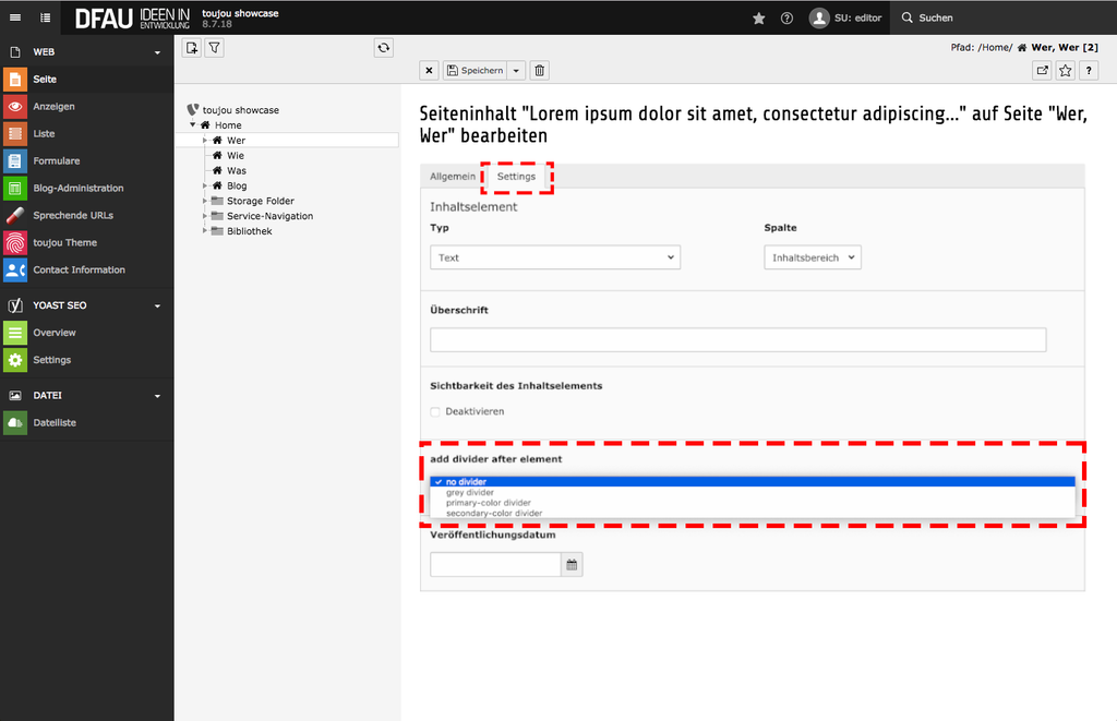 Um die Inhalte im Frontend optisch zu strukturieren, haben Sie die Möglichkeit, Trennlinien anzulegen. In toujou erfolgt das Einsetzen des Dividers allerdings nicht als eigenständiges Inhaltselement, sondern kann von Ihnen innerhalb nahezu aller Elemente aktiviert werden.