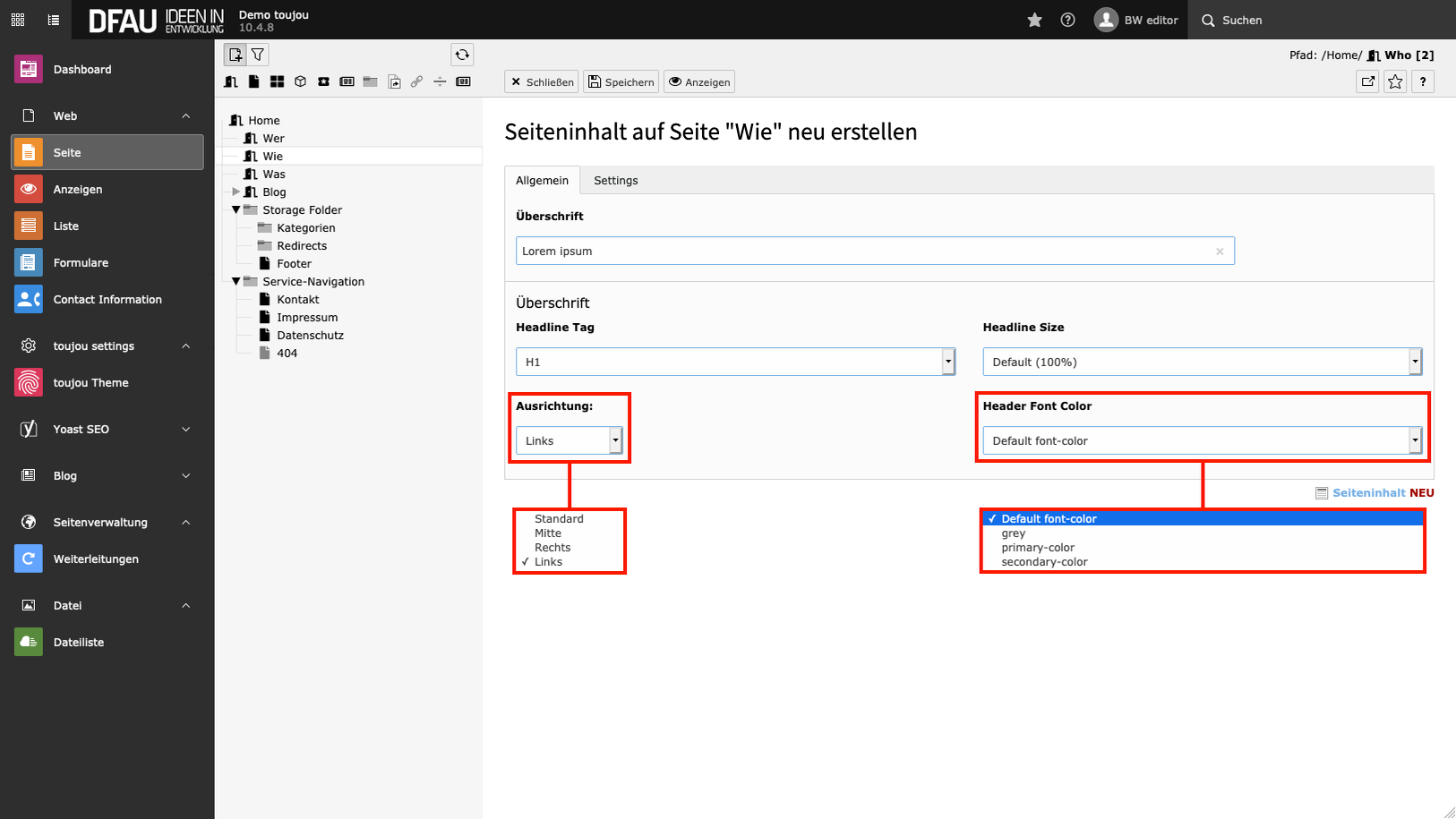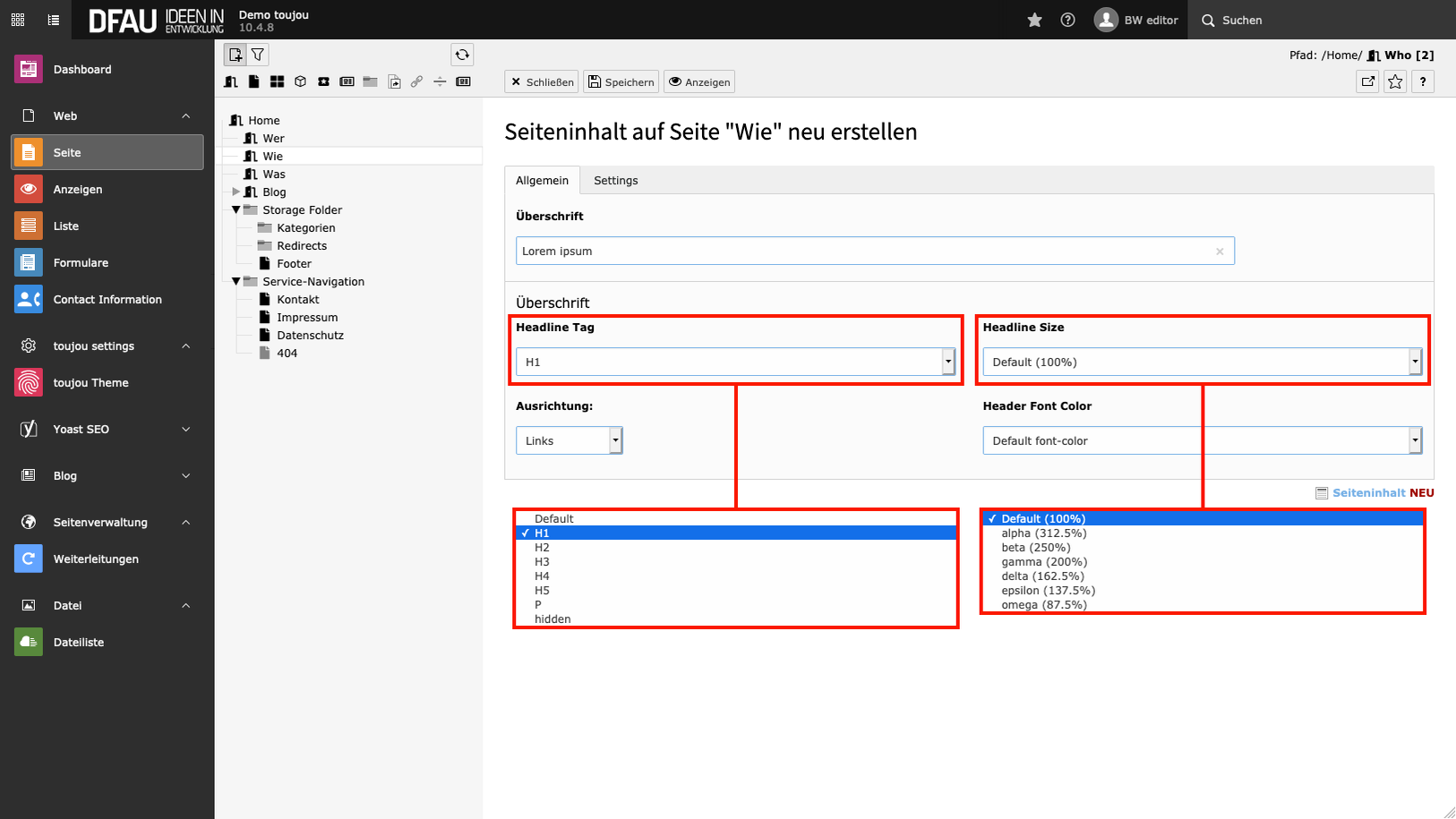 Die Auszeichnungen H1 bis H5 in Verbindung mit der Size-Auswahl Default (100%) bilden stets die in toujou voreingestellte Headline-Größe ab. Um diese zu variieren gelten folgende Orientierungsgrößen: H1 = alpha (312,5%); H2 = beta (250%); H3 = gamma (200%); H4 = delta (162,5%); H5 = epsilon (137,5%); Schriftgröße normal = omega (87,5%).