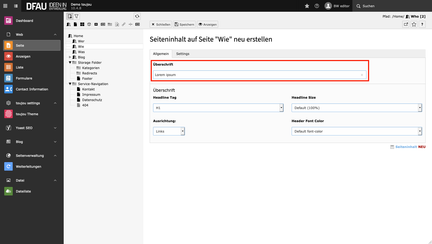 - Klicken Sie auf den Button + Inhalt, um das Headline-Element zu erstellen.