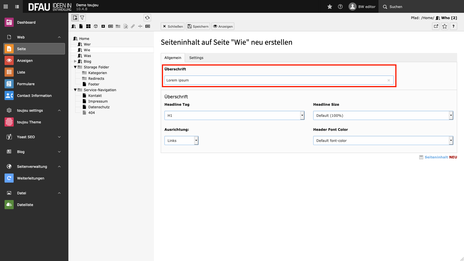 - Variieren Sie unter Headline Size ggf. die Größe, wenn diese vom toujou-Standard abweichen soll.
