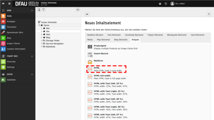 - Im Reiter Widgets wählen Sie HTML (Plain HTML Code in grid width).