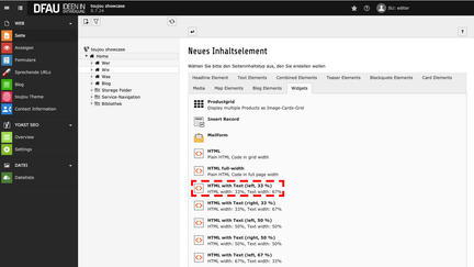 - Im Reiter Widgets wählen Sie HTML with text (left, 33 %); HTML width: 33%, Text width: 67%.
