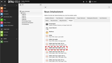 - Im Reiter Widgets wählen Sie HTML with text (right, 33 %); HTML width: 33%, Text width: 67%.