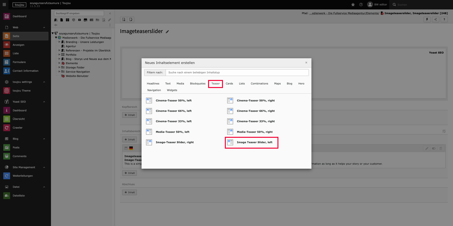 - Im Reiter Teaser Elements wählen Sie Image-Teaser Slider, left.