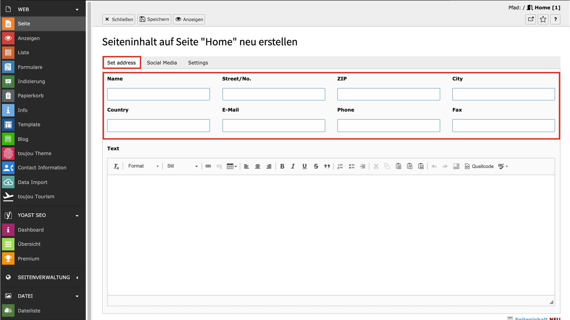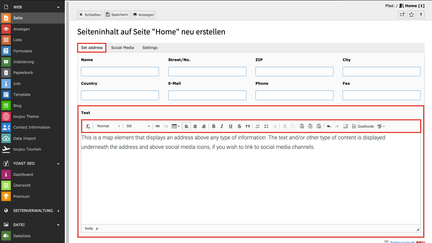 - Die Nutzung dieses Elements bietet sich für die Darstellung von Adressen an, die nicht bereits in Ihren Grundeinstellungen im übergeordneten Menü Contact Information eingetragen sind. Für dieses Element steht Ihnen zusätzlich zur Darstellung der Adresse eine editierbare Textfläche zur Verfügung, in der Sie weitere Informationen frei eingeben können.