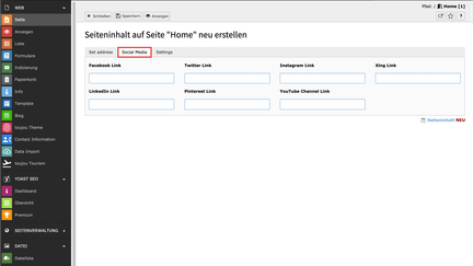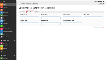 - Im Reiter Social Media haben Sie die Möglichkeit, für diverse Social-Media-Kanäle Verlinkungen zu erstellen.