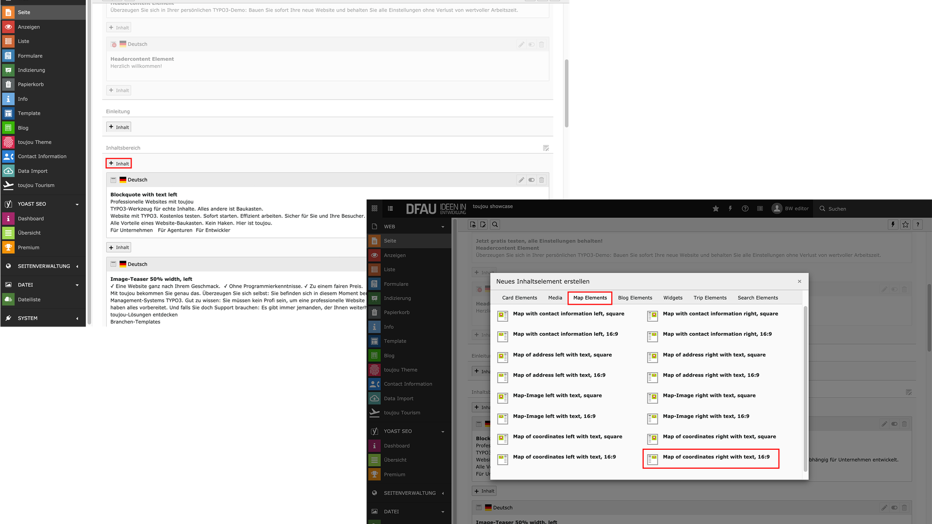 - Klicken Sie auf den Button Inhalt, um ein Karten-Element zu erstellen.