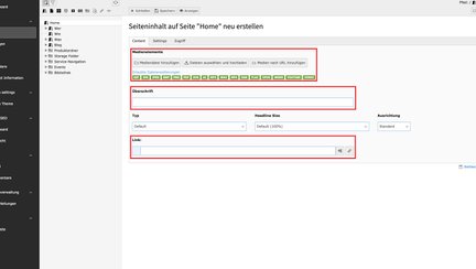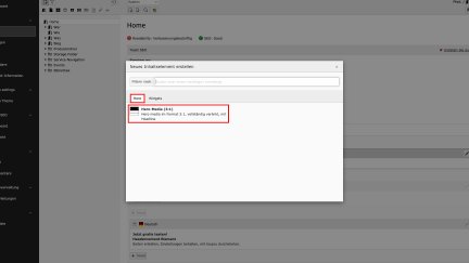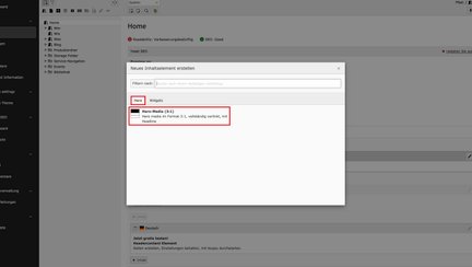 - In diesem Fall haben wir das Element im Headerbereich angelegt. Falls Sie das Hero Media 3:1 im Inhaltsbereich (content area) nutzen, ist die Auswahl der Reiter variantenreicher, weshalb der Reiter Hero an einer anderen Stelle erscheint. Am Vorgehen ändert sich jedoch nichts.