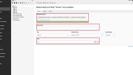 - Unter Medienelemente fügen Sie ein Bild oder Video hinzu. Klicken Sie hierfür auf Add media file um ein Medium aus der Datenbank hochzuladen, Select & upload, um ein Medium vom PC hochzuladen oder Add media via URL, um ein ein Video einzubetten.