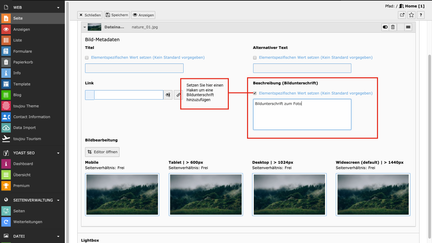 - Unter dem nun hochgeladenen Bild öffnet sich ein Menü zur Bearbeitung der Bild-Metadaten.