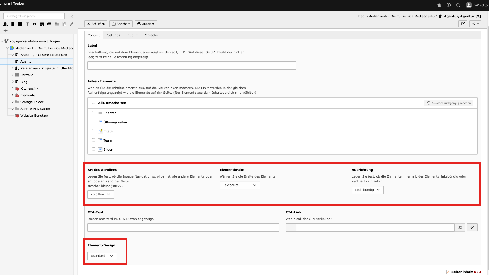 Besonderheit: Im Backend versteckte Inhalte (deaktiviert) werden im Anchor Elements bei den verfügbaren Objekten ebenfalls angezeigt und können daher direkt angewählt werden. Sobald das Element freigeschalten wird, erscheint es dann auch in der Inpage Navigation.