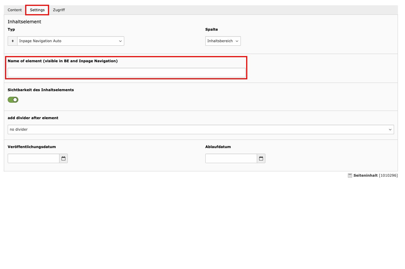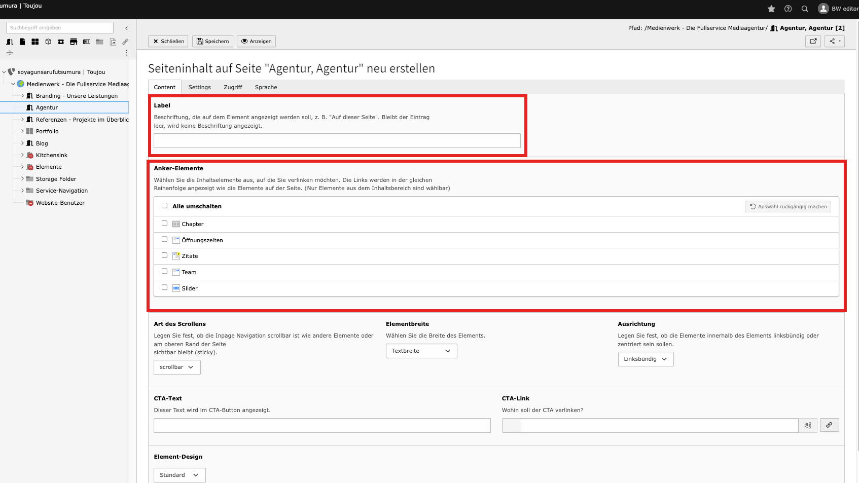 - Im Reiter Content können Sie unter Label dem Element einen Namen geben, beispielsweise »Inhaltsverzeichnis« oder »Auf dieser Seite«.