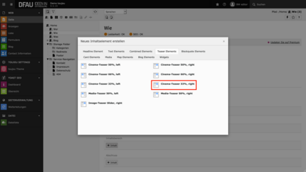 - Im Reiter Teaser Elements wählen Sie Cinema-Teaser 33%, right.