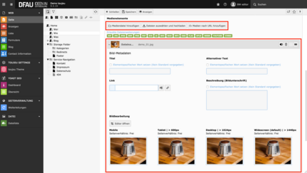- Im Bereich Medienelemente klicken Sie den Button Mediendatei hinzufügen, Dateien auswählen und hochladen oder Medien nach URL hinzufügen.