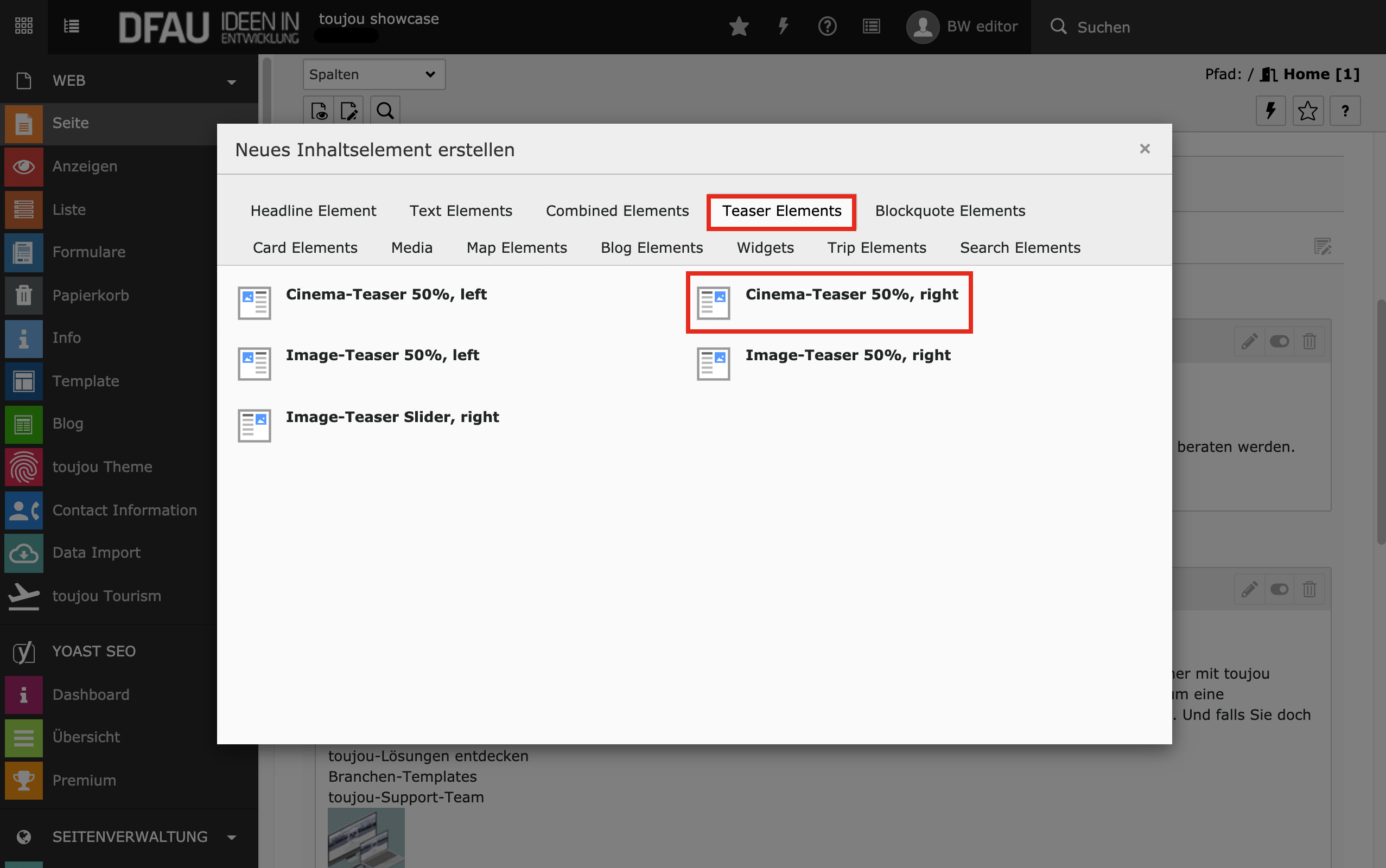 - Im Reiter Teaser Elements wählen Sie Cinema-Teaser 50%, right.