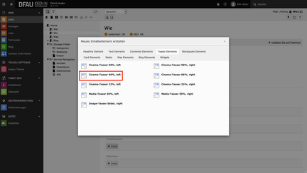 - Im Reiter Teaser Elements wählen Sie Cinema-Teaser 66%, left.