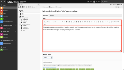 - Klicken Sie auf den Button + Inhalt, um einen Teaser-Element zu erstellen.