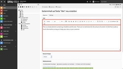 - Im Bereich Medienelemente klicken Sie den Button Mediendatei hinzufügen, Dateien auswählen und hochladen oder Medien nach URL hinzufügen.