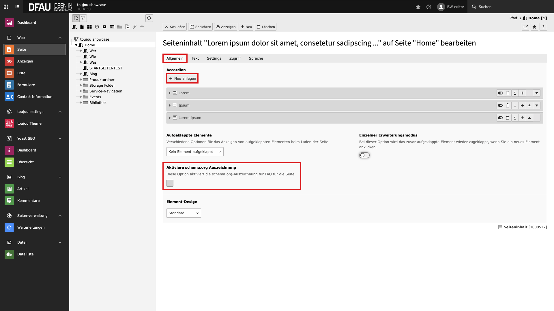 - Für SEO: Um die Schema.org-Auszeichnung für FAQs zu aktivieren, klicken Sie auf das Kästchen, sodass ein grüner Haken erscheint.