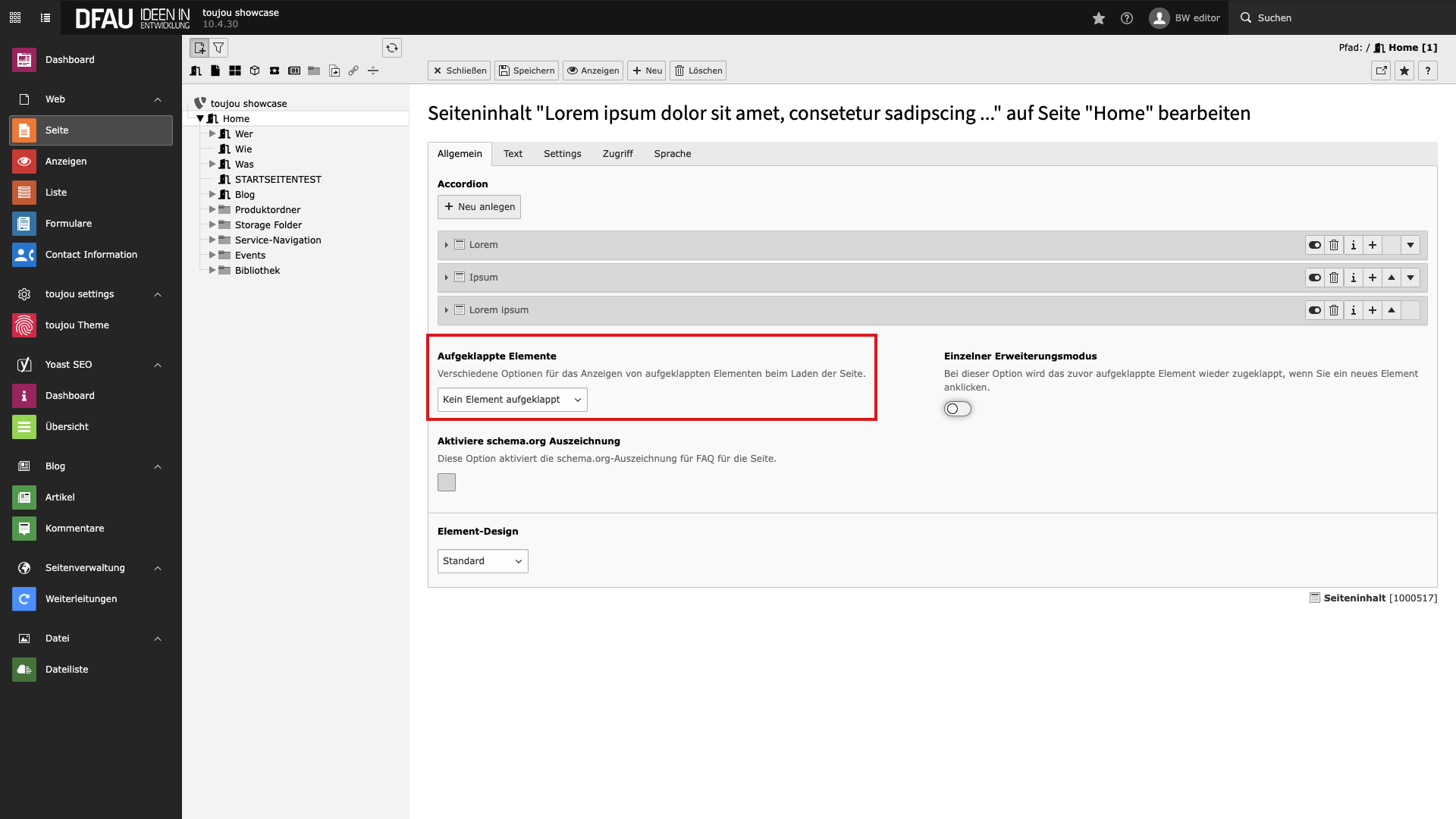 - Zur Auswahl stehen beim Aufrufen einer Seite mit einem Accordion keine, die erste oder alle angelegten Antworten. Standardmäßig wird das erste Element angezeigt.