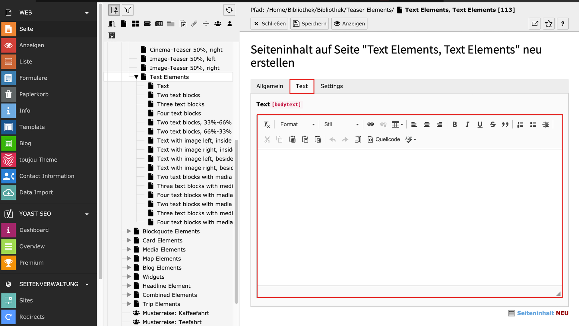 - Um einen Textblock mit Titel und ggf. Untertitel anzulegen, klicken Sie im Reiter Allgemein auf Neu anlegen.