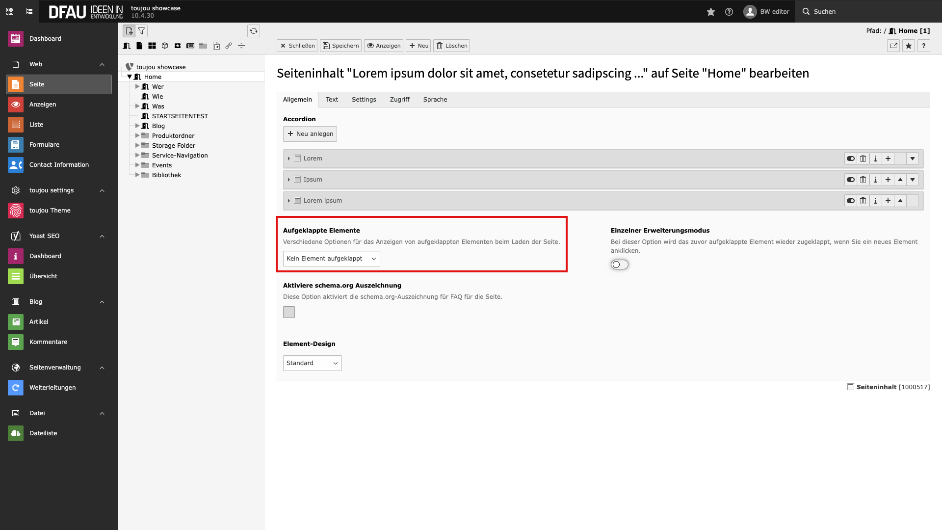 - Zur Auswahl stehen beim Aufrufen einer Seite mit einem Accordion keine, die erste oder alle angelegten Antworten. Standardmäßig wird das erste Element angezeigt.
