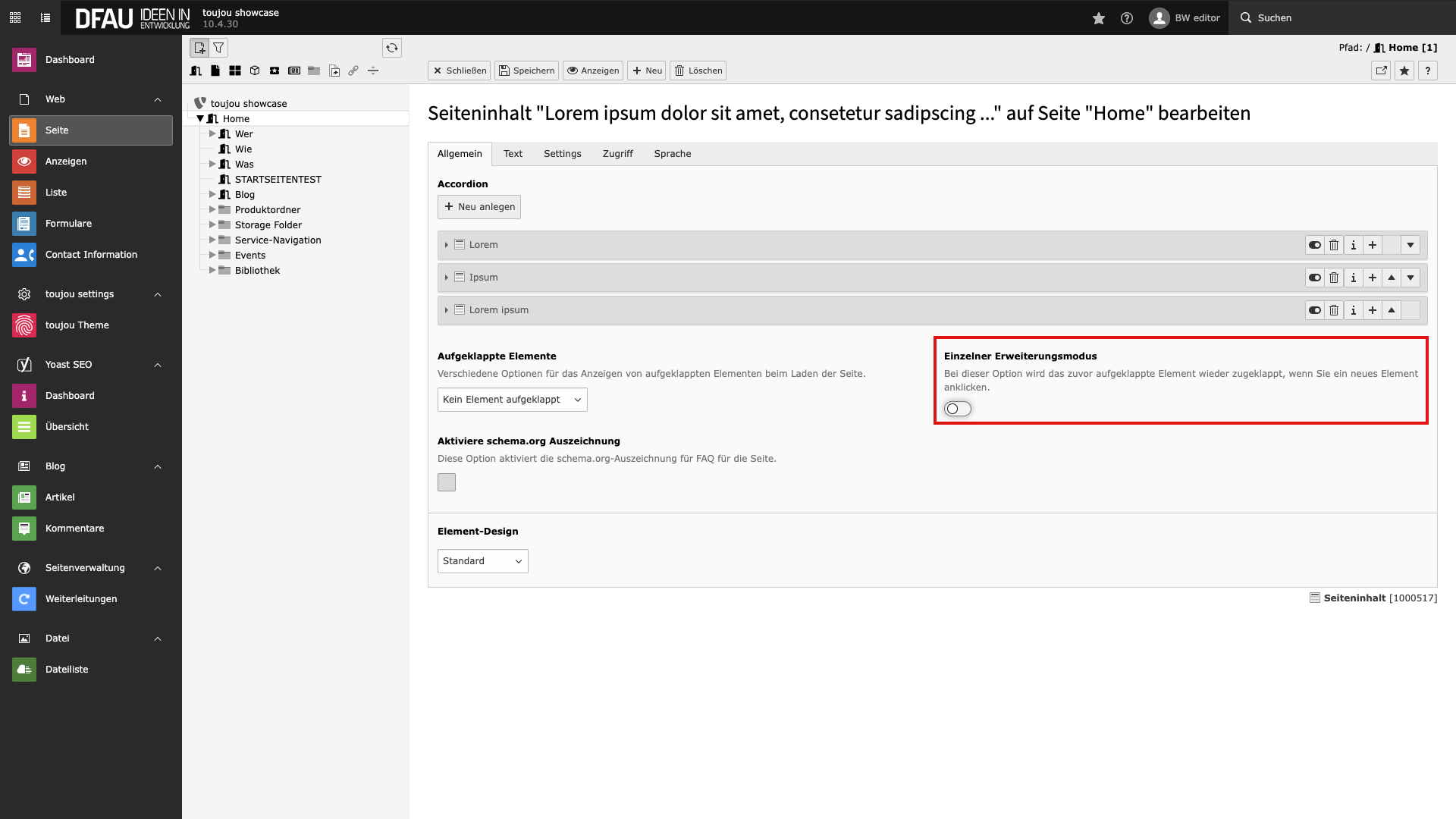- Zur Auswahl stehen beim Aufrufen einer Seite mit einem Accordion keine, die erste oder alle angelegten Antworten. Standardmäßig wird das erste Element angezeigt.