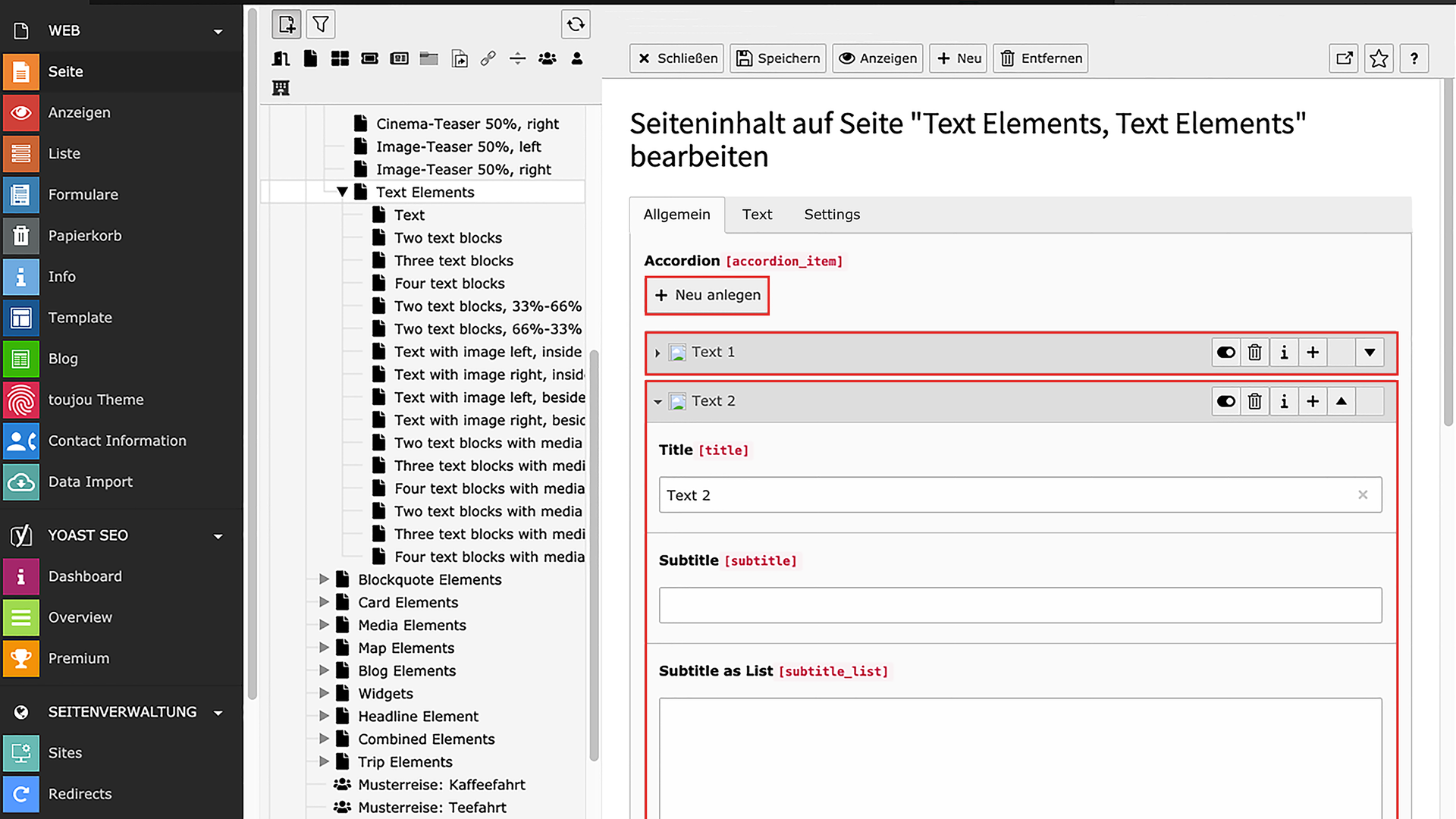 - Klicken Sie auf den Button Inhalt, um eine Akkordeon-Element zu erstellen.