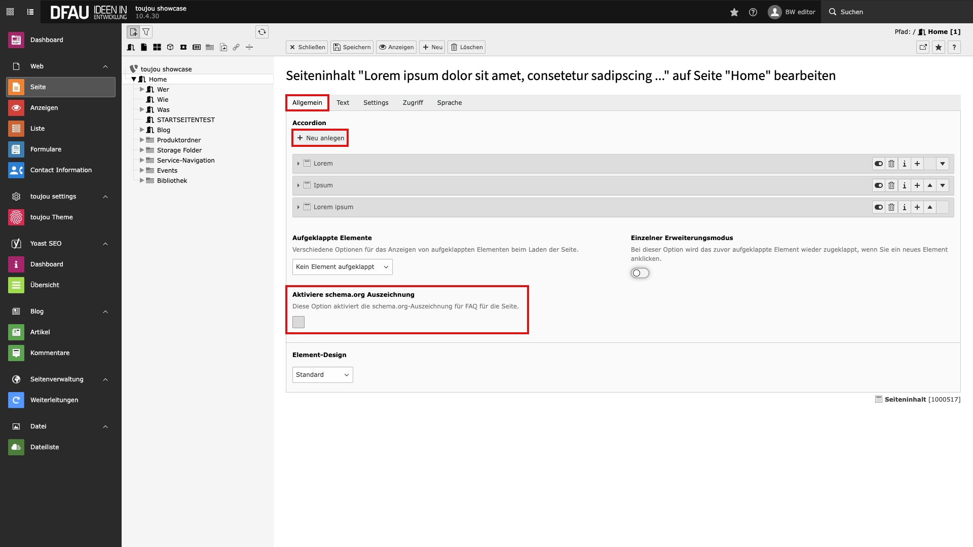 Das Akkordeon-Element ist eine geläufige Darstellungsform für beispielsweise FAQ bzw. Häufig gestellte Fragen. Für SEOs besonders interessant: Mit dem Aktivieren des Schema.org-Markups unterstützen Sie mittels strukturierter Daten Ihre Suchmaschinenoptimierung für FAQ.