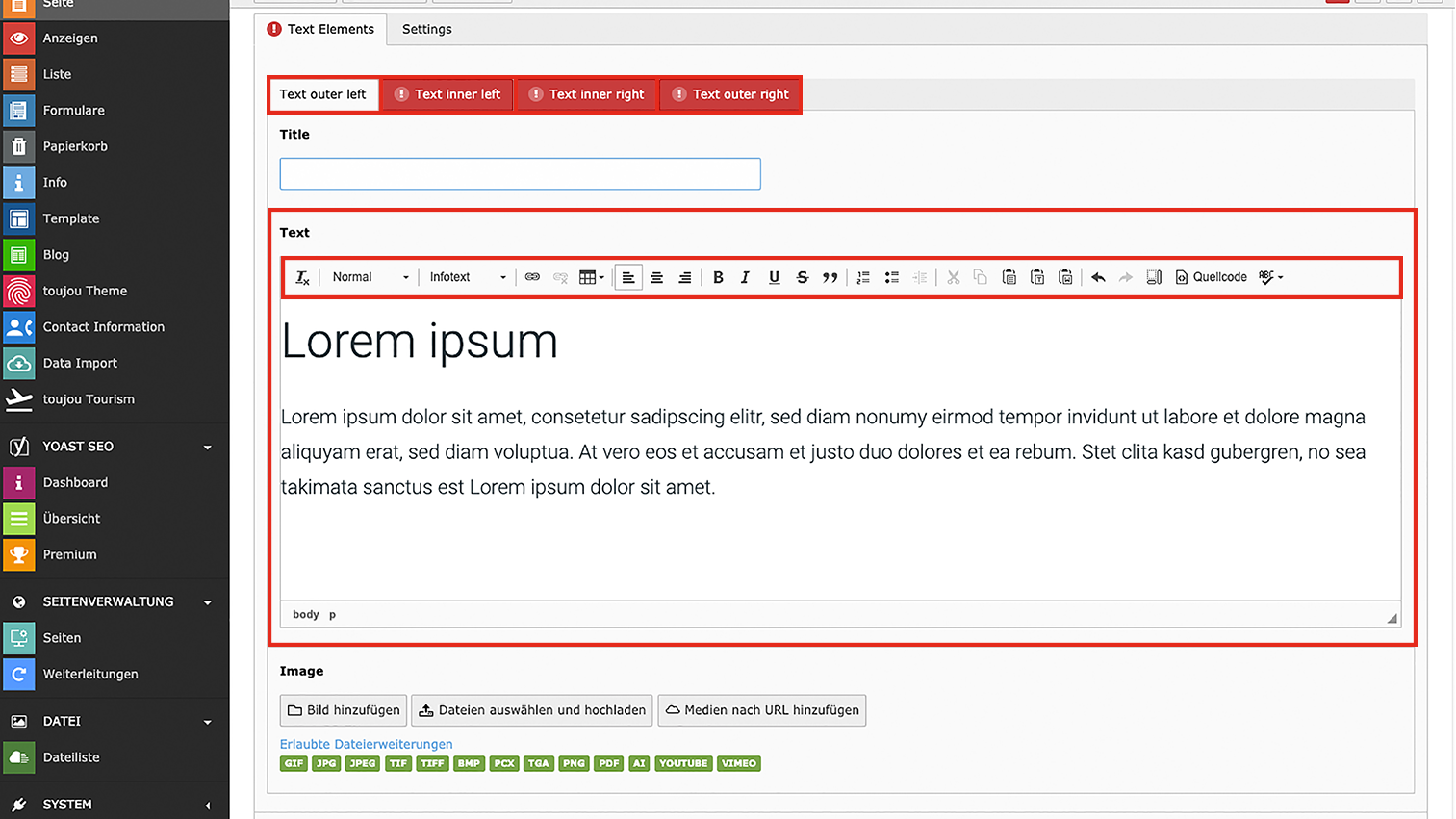 - Klicken Sie auf den Button Inhalt, um einen Textblock zu erstellen.