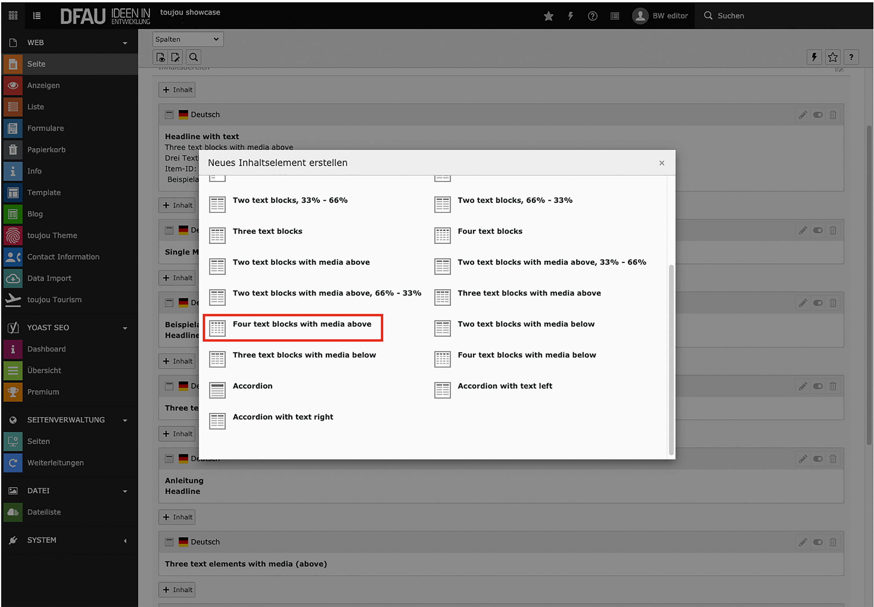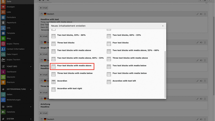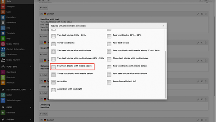 - Im Reiter Text Elements wählen Sie Four text blocks with media above.