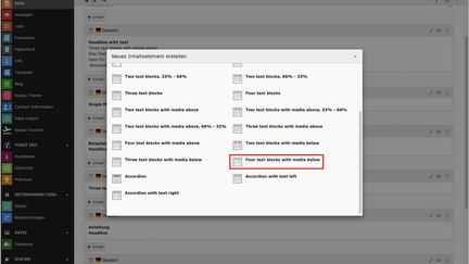 - Im Reiter Text Elements wählen Sie Four text blocks with media below.